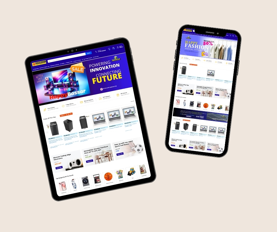 Developed a vibrant, fully responsive e-commerce website for HappyBassar — featuring a visually engaging layout with promotional highlights across diverse categories such as electronics (up to 20% off) and minimalist wooden furniture (up to 40% off). The platform offers intuitive product browsing and filtering, streamlined seller onboarding and product syncing tools, dynamic sales banners, and a mobile-first, SEO-friendly design to boost both customer engagement and seller conversions.